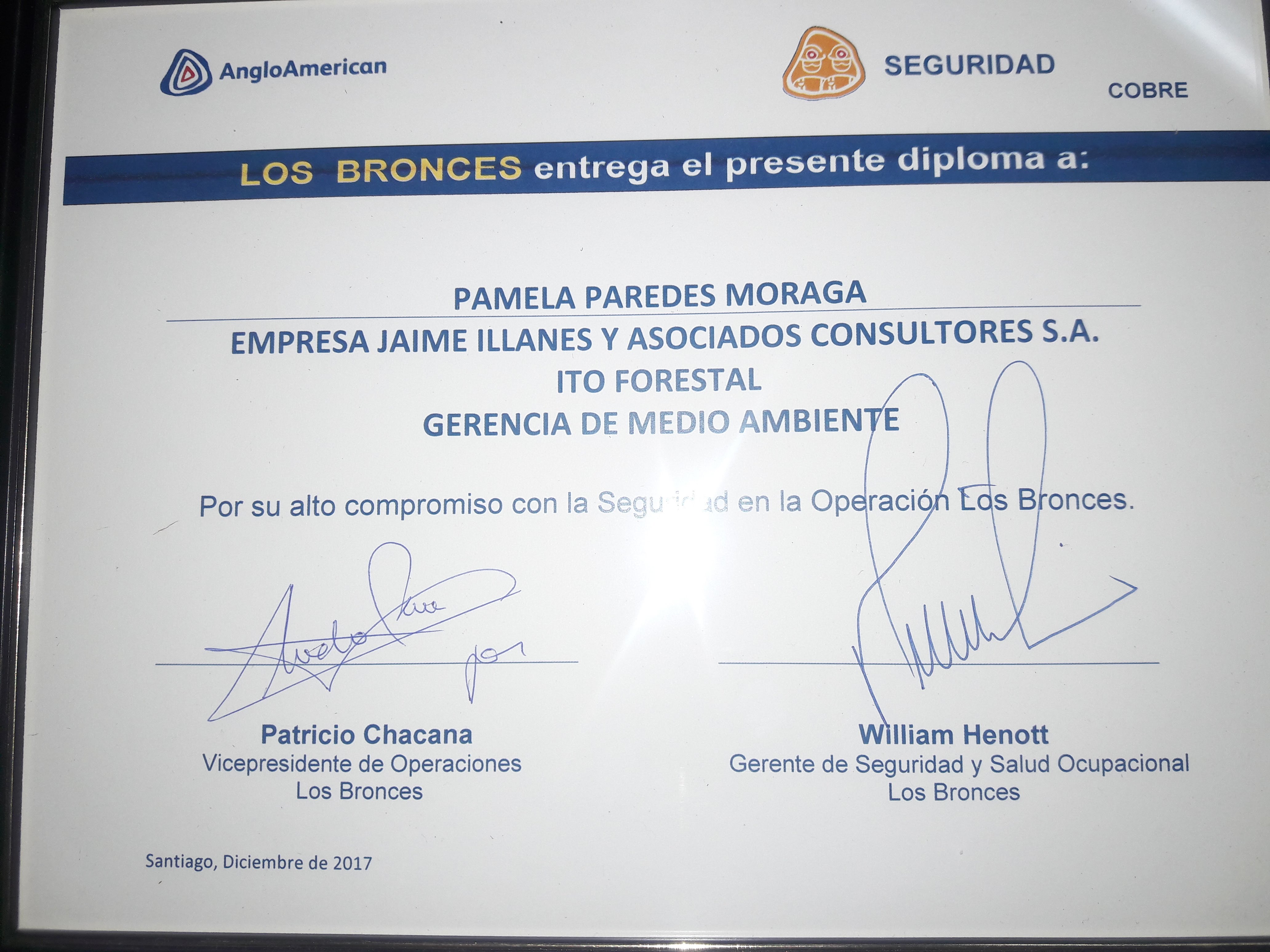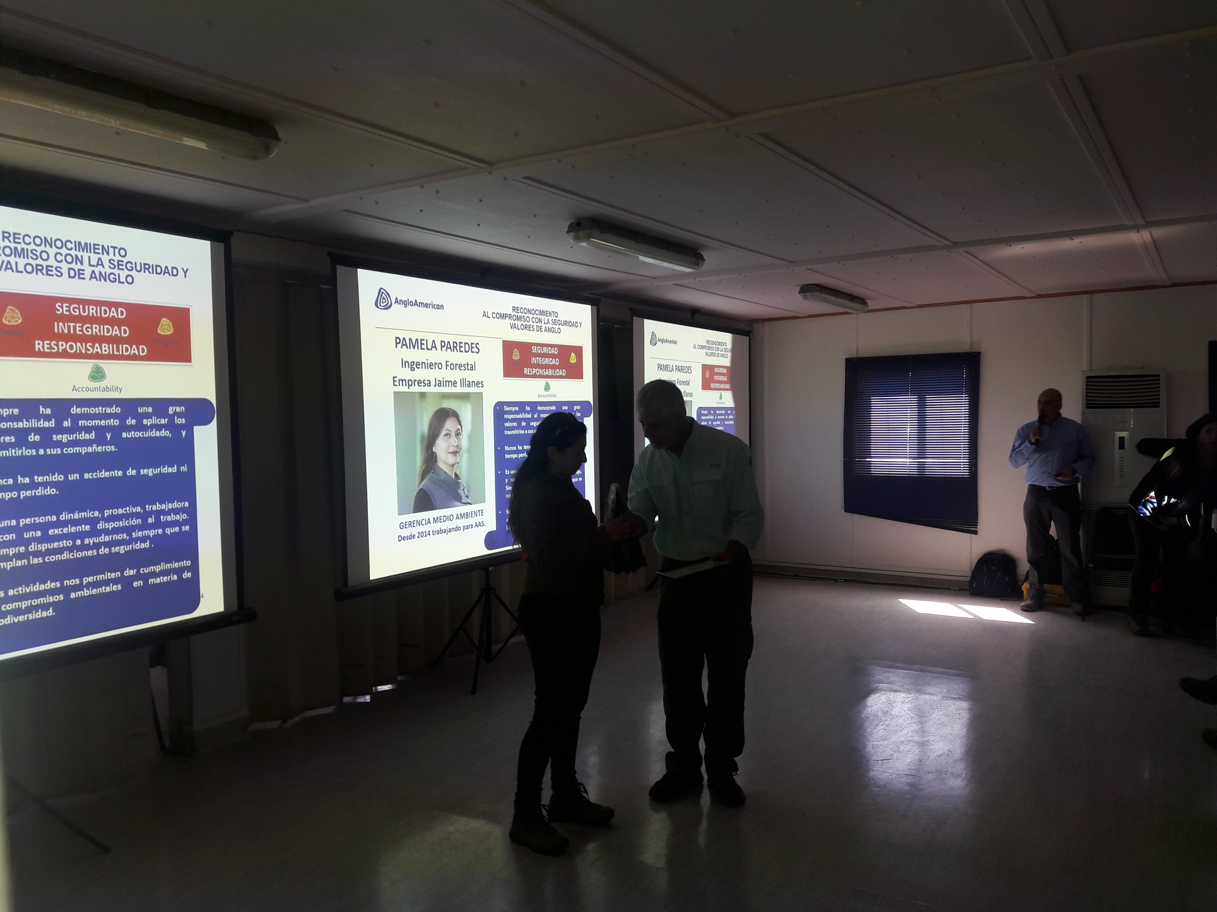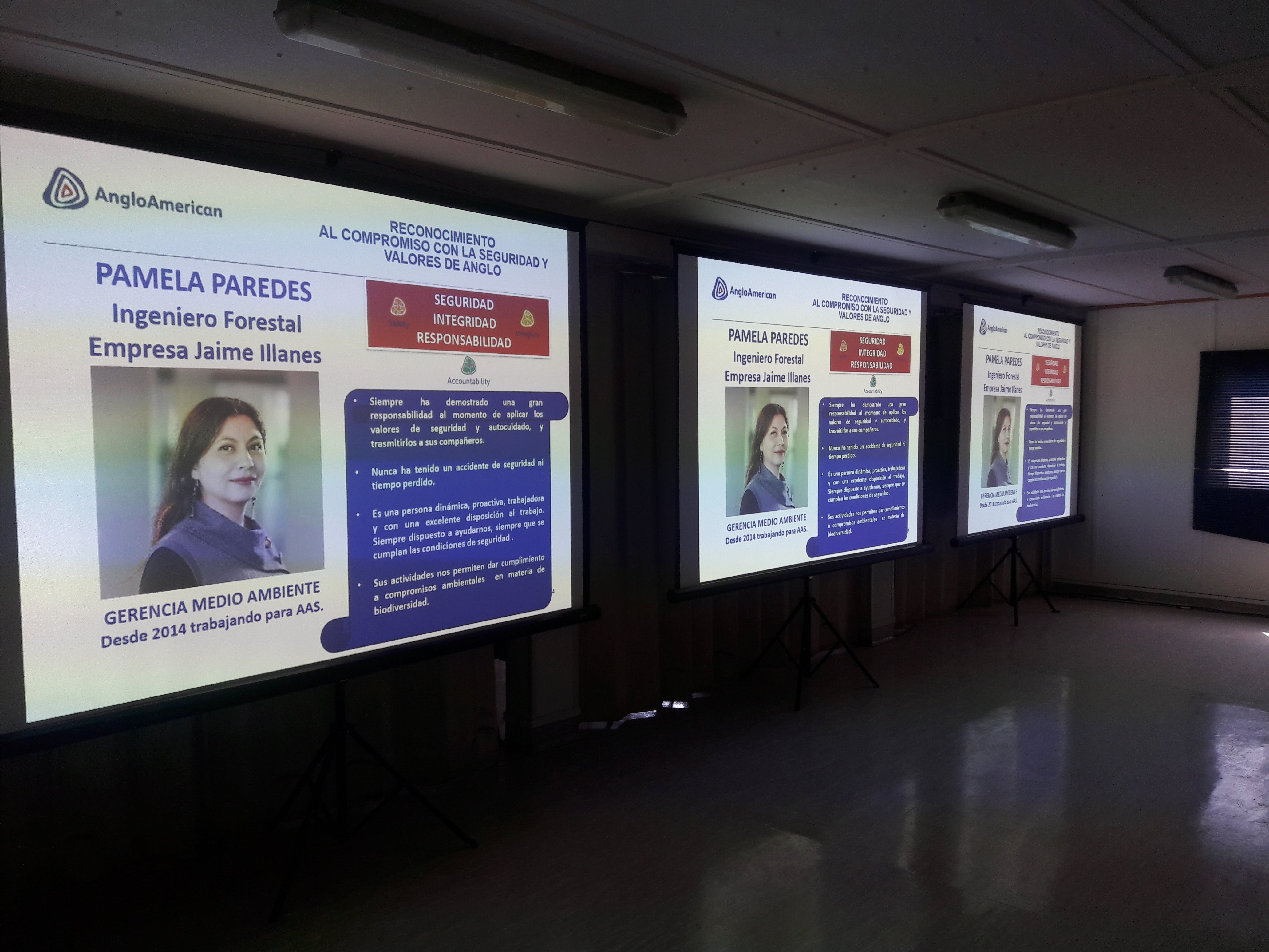 Hoy 07 de diciembre, en el Comité Mensual de Seguridad y Medio Ambiente de Angloamerican, en donde participan todas las empresa contratistas de Los Bronces y Las Tórtolas, se premió públicamente a nuestra compañera Pamela Paredes, por su constante compromiso y actitud con la seguridad, según los estándares y valores de Angloamerican; destacándose además por su profesionalismo y compromiso en todos estos años trabajando en JIA para este importante cliente.